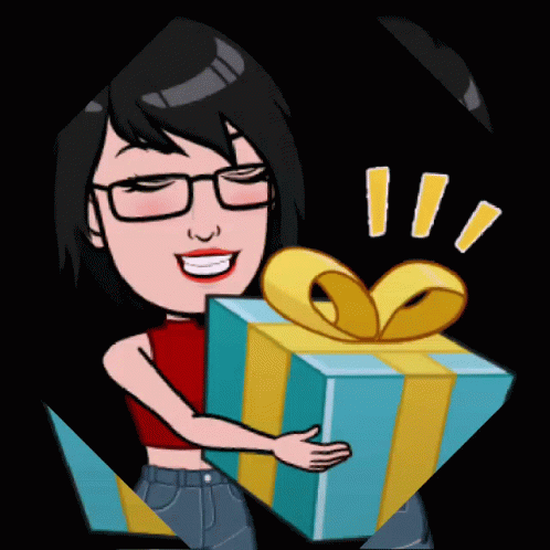 A happy animated woman with glasses smiles while holding a blue gift box with a yellow ribbon.