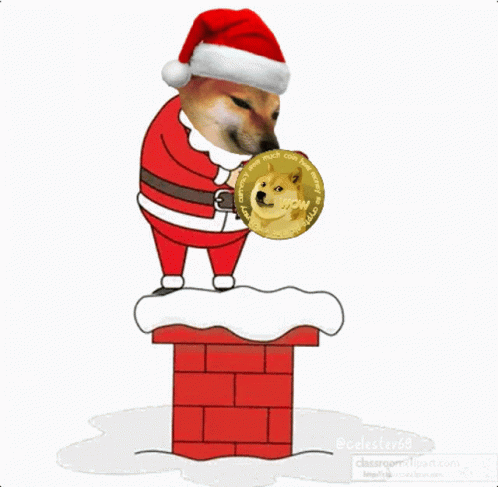 Cheems dog dressed as Santa on a chimney, holding a golden Dogecoin with 'wow' written on it.