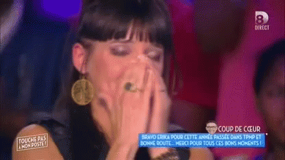 Erika gets emotional and cries on the French TV show TPMP, then smiles through her tears.
