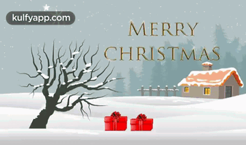 An animated Christmas scene with a car delivering gifts, a decorated tree, and a 'Merry Christmas' greeting.