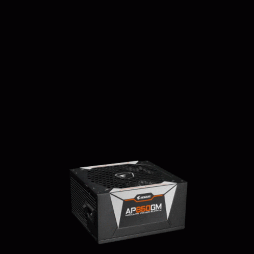 A Gigabyte AORUS AP850GM power supply unit (PSU) dramatically catches fire, with flames rising from its top.