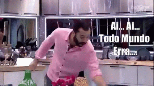 Gil do Vigor in a pink shirt in the kitchen, with the caption 'Todo Mundo Erra'.