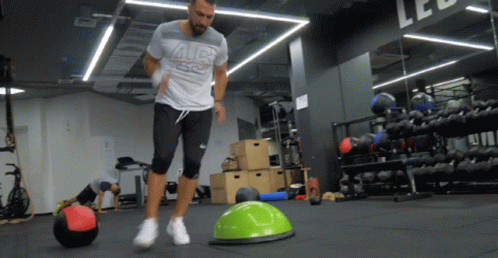 Man performing agility drills on a bosu ball in a gym, warming up for fitness.