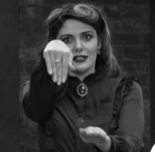 Gina Devivo performs expressive hand gestures in a black and white, vintage-style setting.