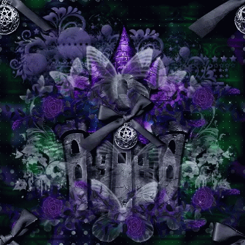 Gina101's glittery painting of a magical castle surrounded by vibrant purple flowers.