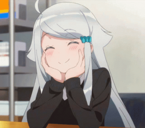 Happy anime girl with white hair smiling sweetly, resting her chin on her hands.