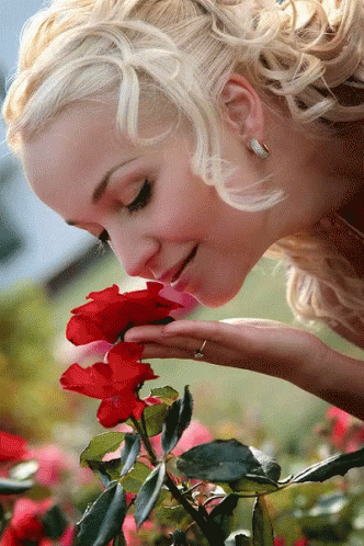 A blonde woman gently smells a vibrant red rose, holding it delicately in her hand.