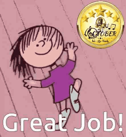 A cartoon girl dancing with a 'Great Job!' message and an 'October' badge, related to Gitapro1 Okr1.