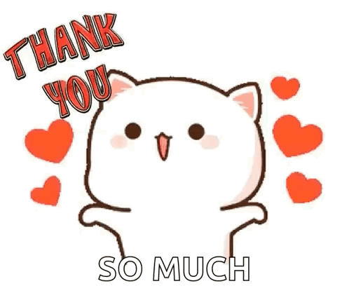 Cute cartoon cat, Gitapro3 Gitagita, saying 'Thank You So Much' with hearts appearing.