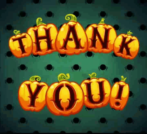 A festive thank you card featuring pumpkins spelling 'THANK YOU!' and spiders on a green background.