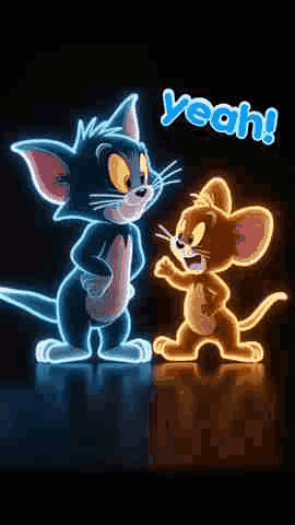 Tom and Jerry glow in a vibrant neon animation, with the word 'Yeah!' appearing on screen.