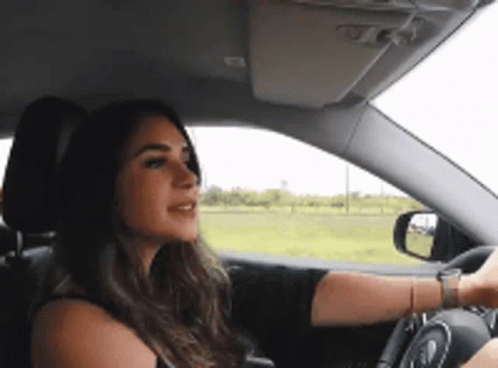 Gizelly Beijo enjoys a scenic road trip, driving her car with a relaxed expression.