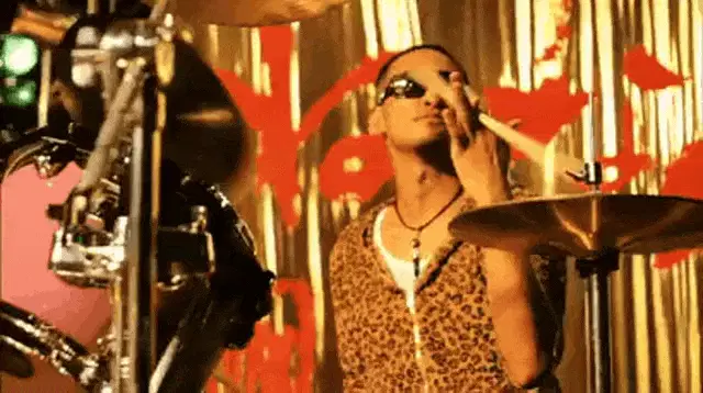 Gizelly Furacao making expressive faces and movements while sitting on a couch against a red wall.