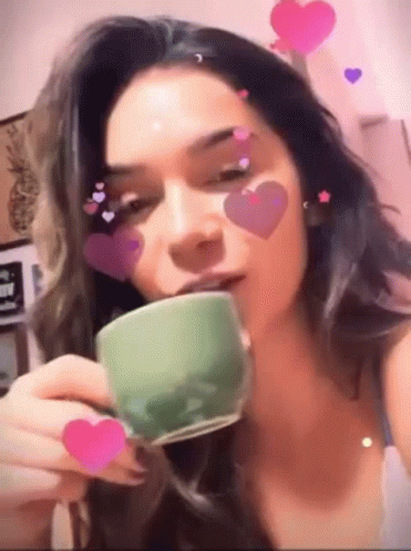 Gizelly Bicalho sips coffee from a green cup, surrounded by animated pink and purple heart filters.