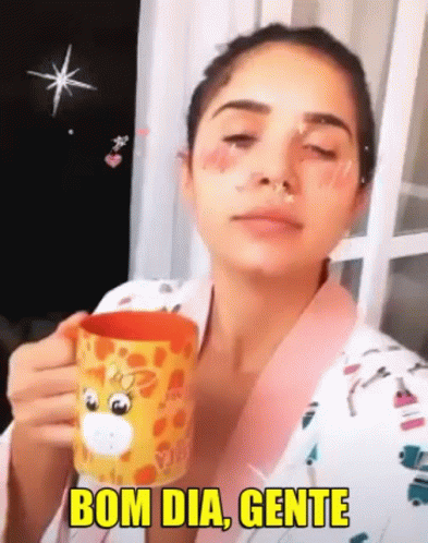 Gizelly Bicalho greets viewers with 'Bom Dia' while holding a cute giraffe mug, wearing a robe with a sparkly filter.