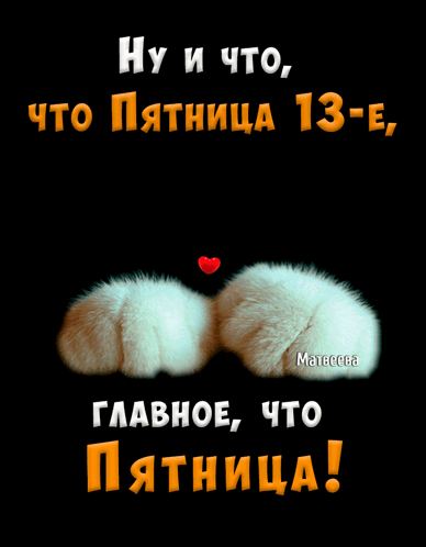 A black cat's white paws and yellow eyes with a red heart, featuring Russian text about Friday.