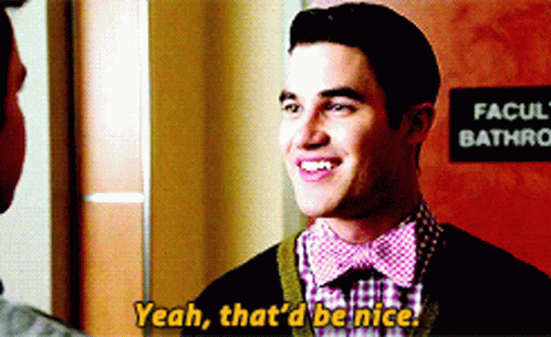 Blaine Anderson, portrayed by Darren Criss in Glee, smiles and delivers the line 'Yeah, that'd be nice.'