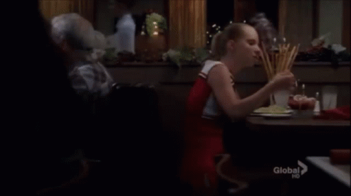 Brittany Pierce and Santana Lopez enjoy a dinner date at a restaurant, sharing a romantic moment.