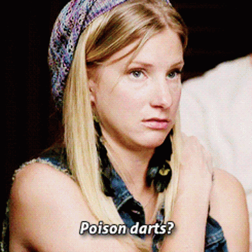 Brittany Pierce (Heather Morris) from Glee, wearing a beanie and denim, asks 'Poison darts?'