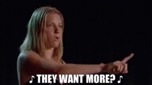 Glee's Brittany Pierce, played by Heather Morris, points and asks, 'They want more?' in an iconic moment.