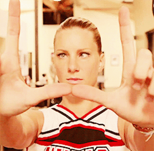 Brittany Pierce from Glee makes the 'Take The L' sign with her hands, wearing a cheerleader uniform.