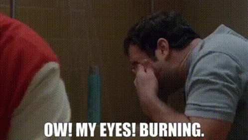 a man is covering his face with his hand while another man says `` ow ! my eyes ! burning . ''