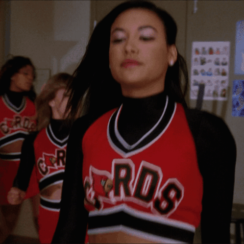 Santana Lopez from Glee performs a confident hair flip with a smug expression while in her cheerleading uniform.