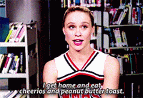 Kitty Wilde (Becca Tobin) from Glee shares her post-school snack: cheerios and peanut butter toast.