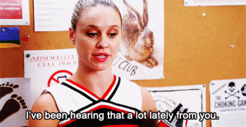 Becca Tobin as Kitty Wilde from Glee, in a cheerleader uniform, says "I've been hearing that a lot lately from you."