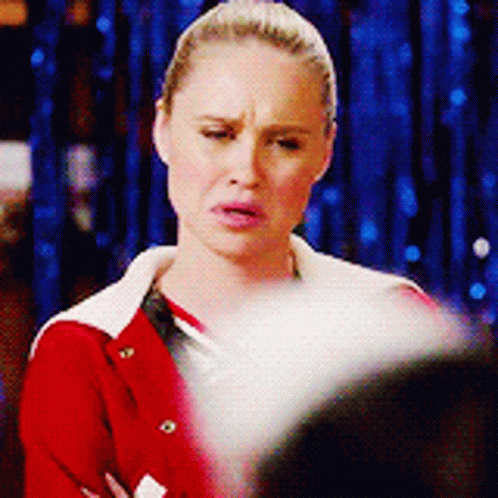 Kitty Wilde from Glee, portrayed by Becca Tobin, shows a disgusted reaction, shaking her head in disapproval.