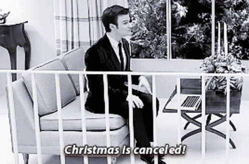Kurt Hummel from Glee, played by Chris Colfer, declares 'Christmas is canceled!' while sitting on a couch.