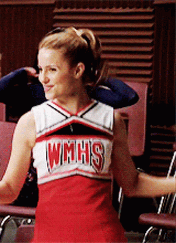 Quinn Fabray, portrayed by Dianna Agron, dances energetically in her WMHS cheerleader uniform from Glee.
