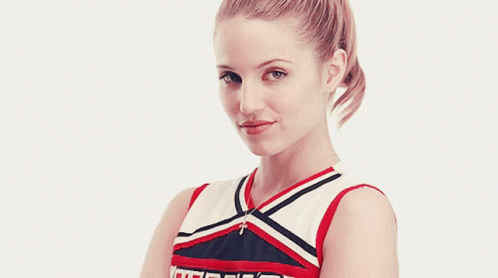 Quinn Fabray, portrayed by Dianna Agron, as a cheerleader in her red, white, and blue uniform.