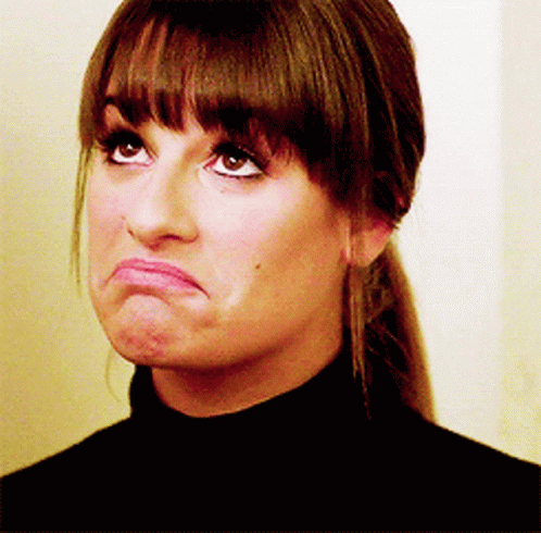 Rachel Berry (Lea Michele) from Glee makes a 'welp' face, then subtly smiles, showing her expressive range.
