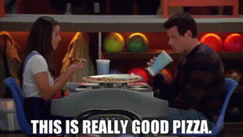 Rachel Berry and Finn Hudson from Glee enjoy pizza, with Rachel exclaiming, "This is really good pizza."