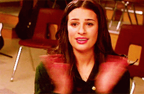 Rachel Berry, portrayed by Lea Michele, claps enthusiastically with a bright smile in a classroom setting.