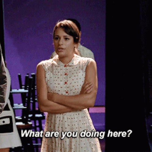 Rachel Berry from Glee, played by Lea Michele, asks 'What are you doing here?' with arms crossed.
