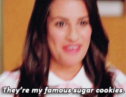Rachel Berry, played by Lea Michele, proudly declares, 'They're my famous sugar cookies!' in a scene from Glee.