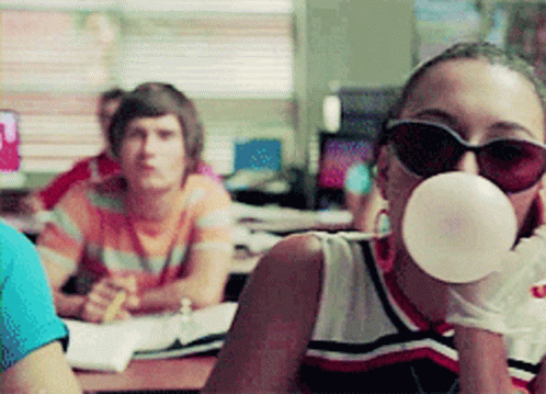 Santana Lopez (Naya Rivera) from Glee, wearing sunglasses and a cheerleader top, blowing bubblegum in a classroom.