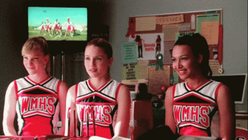 Brittany Pierce, Quinn Fabray, and Santana Lopez (Heather Morris, Dianna Agron, Naya Rivera) as the Glee Unholy Trinity cheerleaders high-fiving.