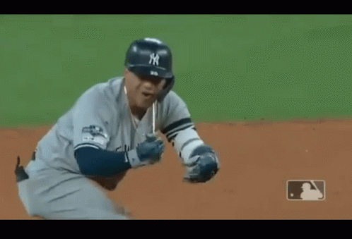 Gleyber Torres, a New York Yankees baseball player, reacts on the field with dirt on his jersey.