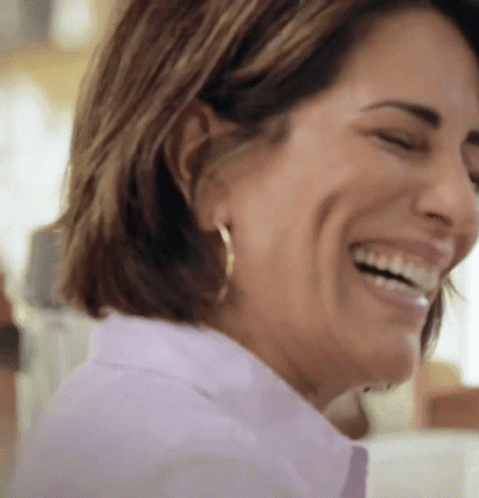 Brazilian actress Gloria Pires smiles and laughs joyfully, wearing hoop earrings and a light-colored collared shirt.