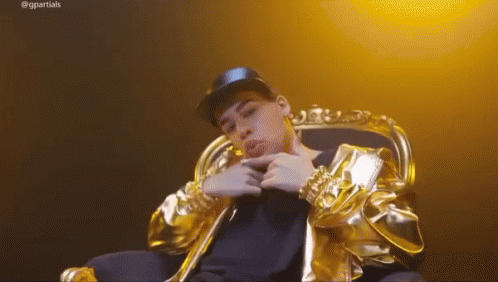 Gloriagroove Mano striking a dynamic rap pose, wearing a shiny gold jacket and a black hat.