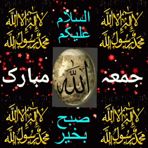 Animated greeting for Blessed Friday, featuring Islamic calligraphy and phrases like 'Peace be upon you' and 'Good Morning'.
