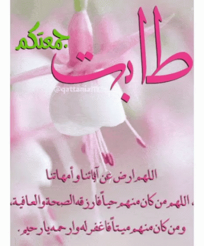 A beautiful close-up of pink flowers with an Arabic Friday greeting wishing remembrance, obedience, happiness, and fulfilled wishes.
