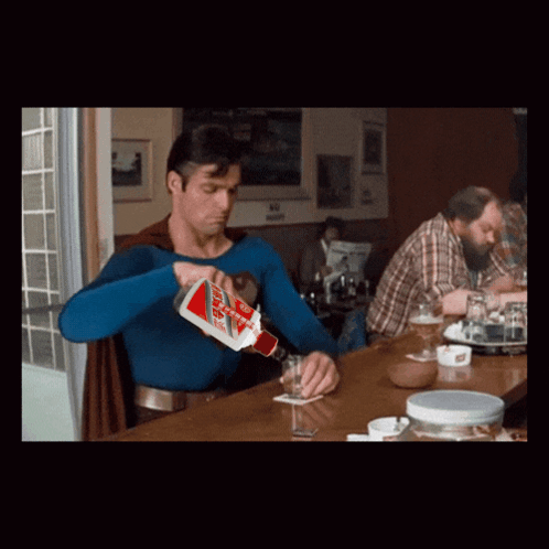Superman, in his iconic suit, pours a bottle of GMoutai into a glass at a bar, offering 'super shots'.