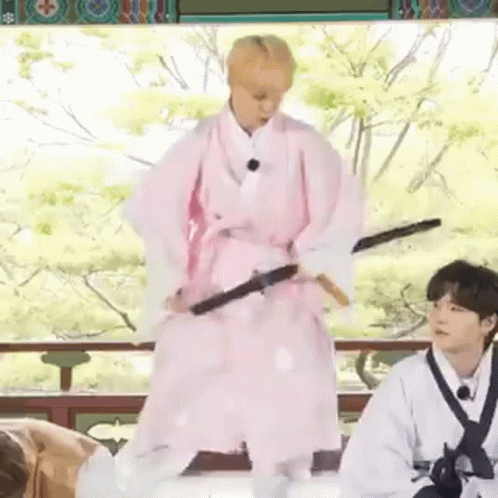 Jimin performs an energetic kick while wearing a vibrant pink traditional Korean outfit on a stage.