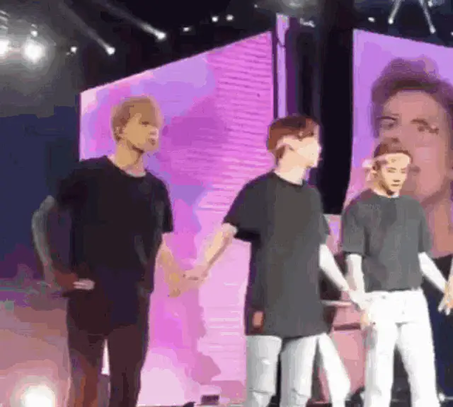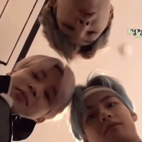 Gngvante and Taegimin, along with another member, look down at the camera from above, creating an inverted perspective.