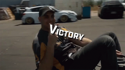 A man celebrates his go-cart victory, flashing a peace sign and thumbs up with 'VICTORY' text.