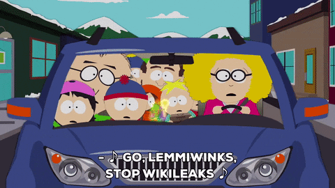 The South Park gang, including Stan, Kyle, Cartman, Butters, Randy, and Sharon, drive while singing about Lemmiwinks stopping Wikileaks.